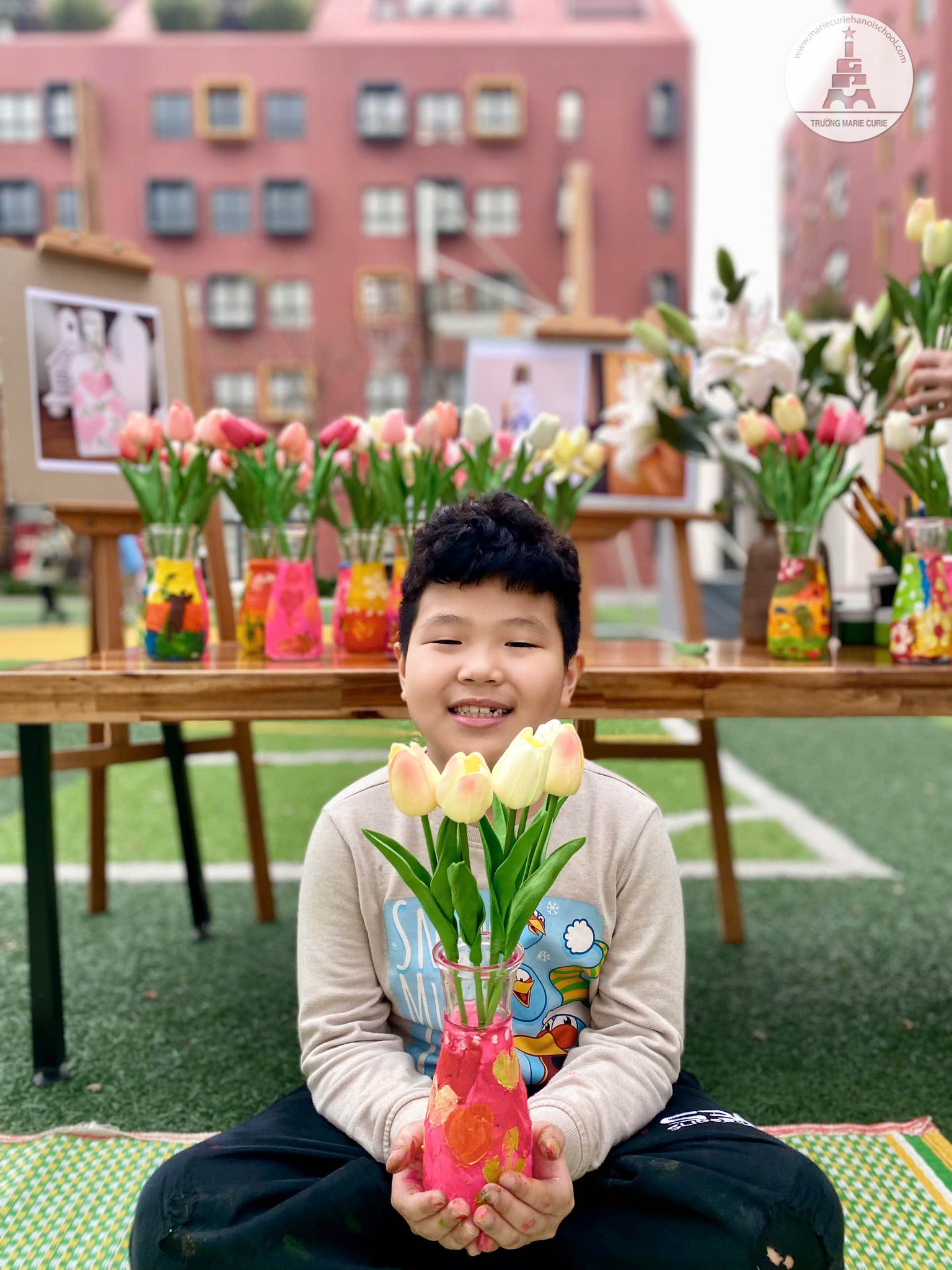 “Chúng tôi chuẩn bị trước 2 hôm diễn ra hoạt động. Các con được thỏa sức trang trí lên lọ thủy tinh. Sau khi các cô hỗ trợ sấy, các con cắm hoa tulip lụa vào lọ để mang về tặng mẹ. Các con còn tỉ mẩn, nắn nót viết lời chúc lên thiệp rồi treo lên cành hoa.