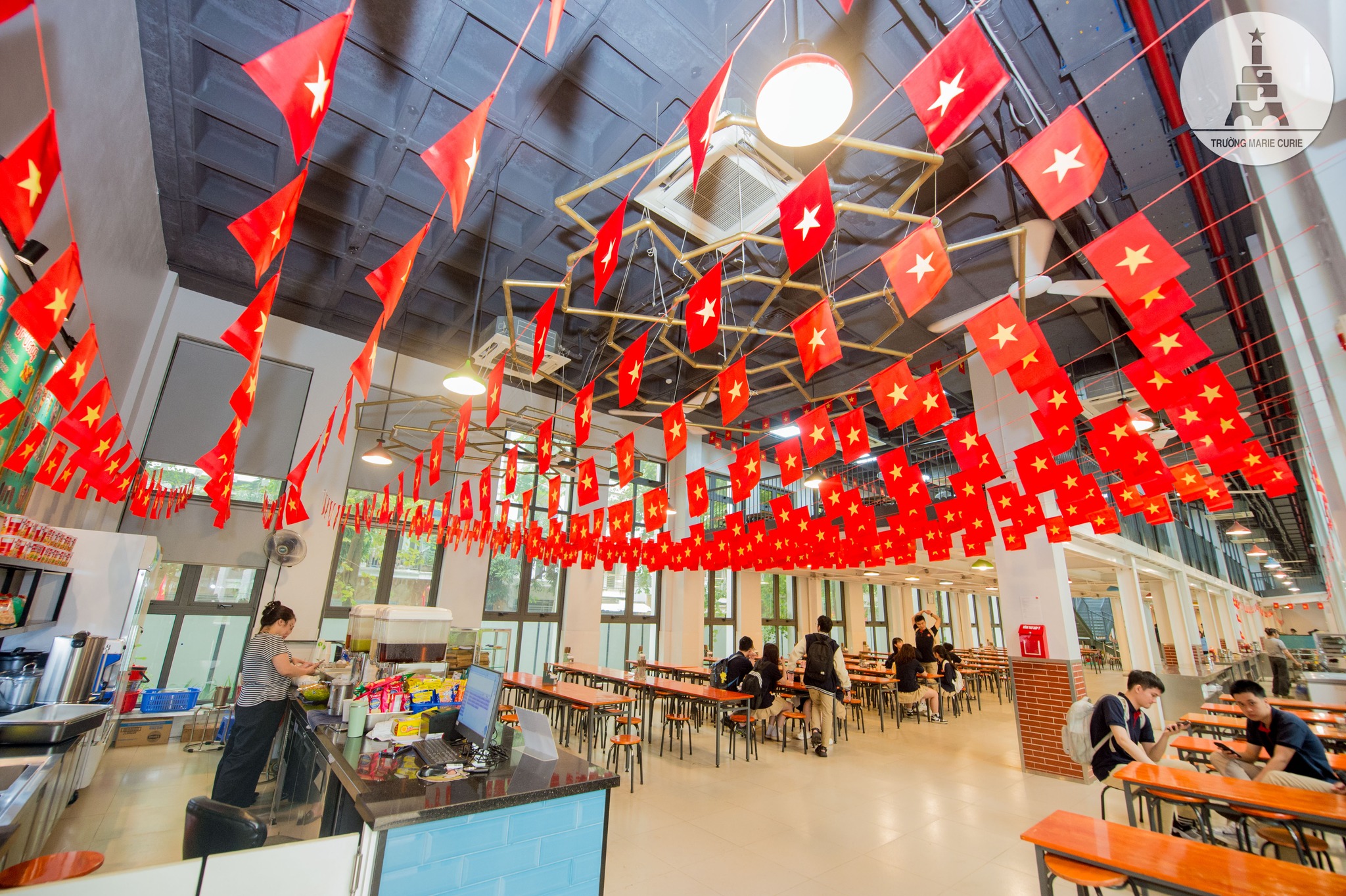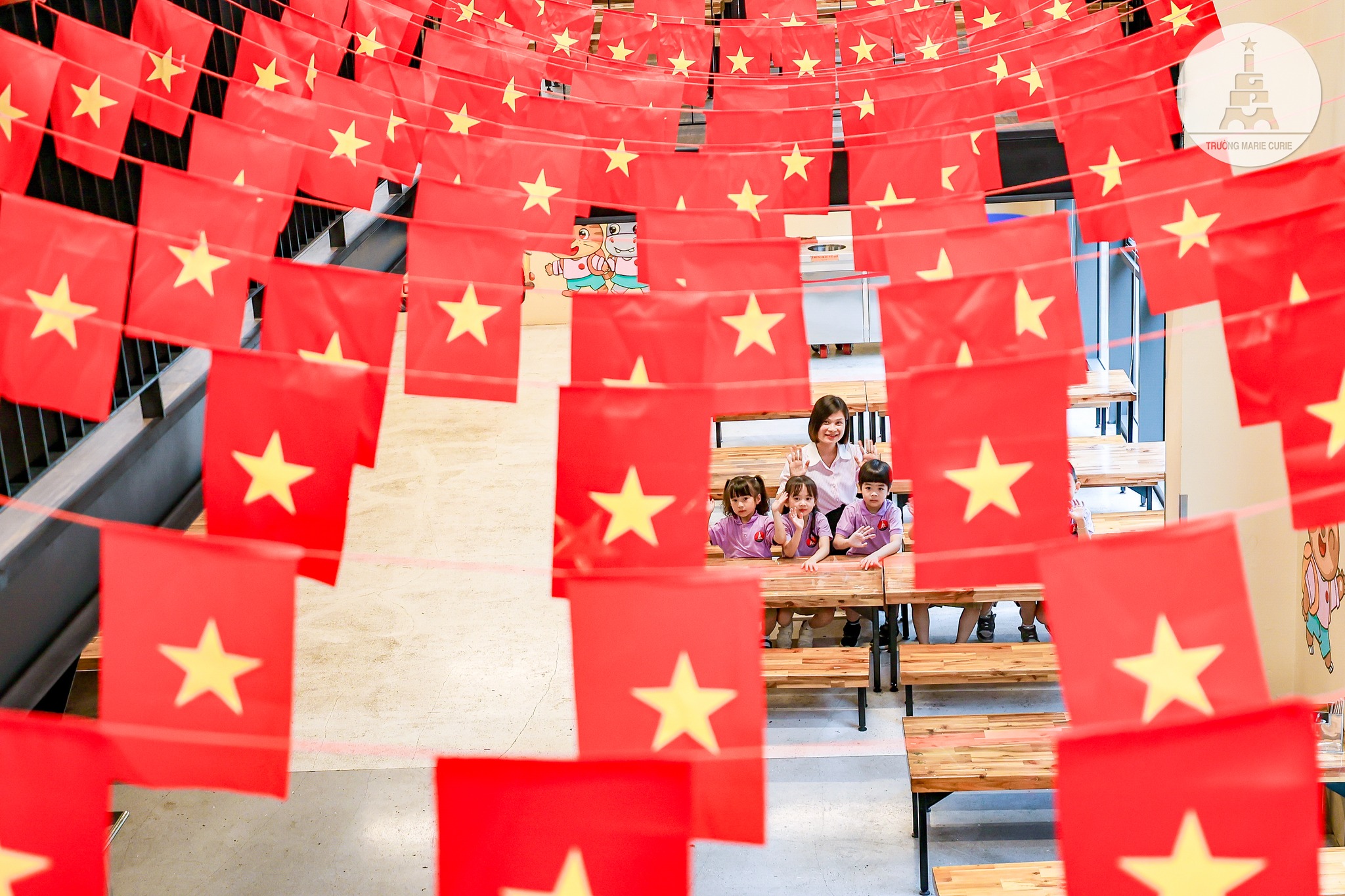 Say sưa ngắm nhìn không gian canteen, cô Kim Lan (GV Star 3) chia sẻ: “Canteen quen thuộc bỗng rực rỡ bởi sắc đỏ của những lá cờ. Mỗi lần đi ngang qua, tôi lại thấy lòng lắng lại với niềm tự hào và biết ơn sâu sắc. Những khoảnh khắc bình dị ấy càng khiến tôi thêm yêu nghề, yêu mái trường Marie Curie và trân trọng những giá trị tốt đẹp mà các con đang lớn lên cùng mỗi ngày”.