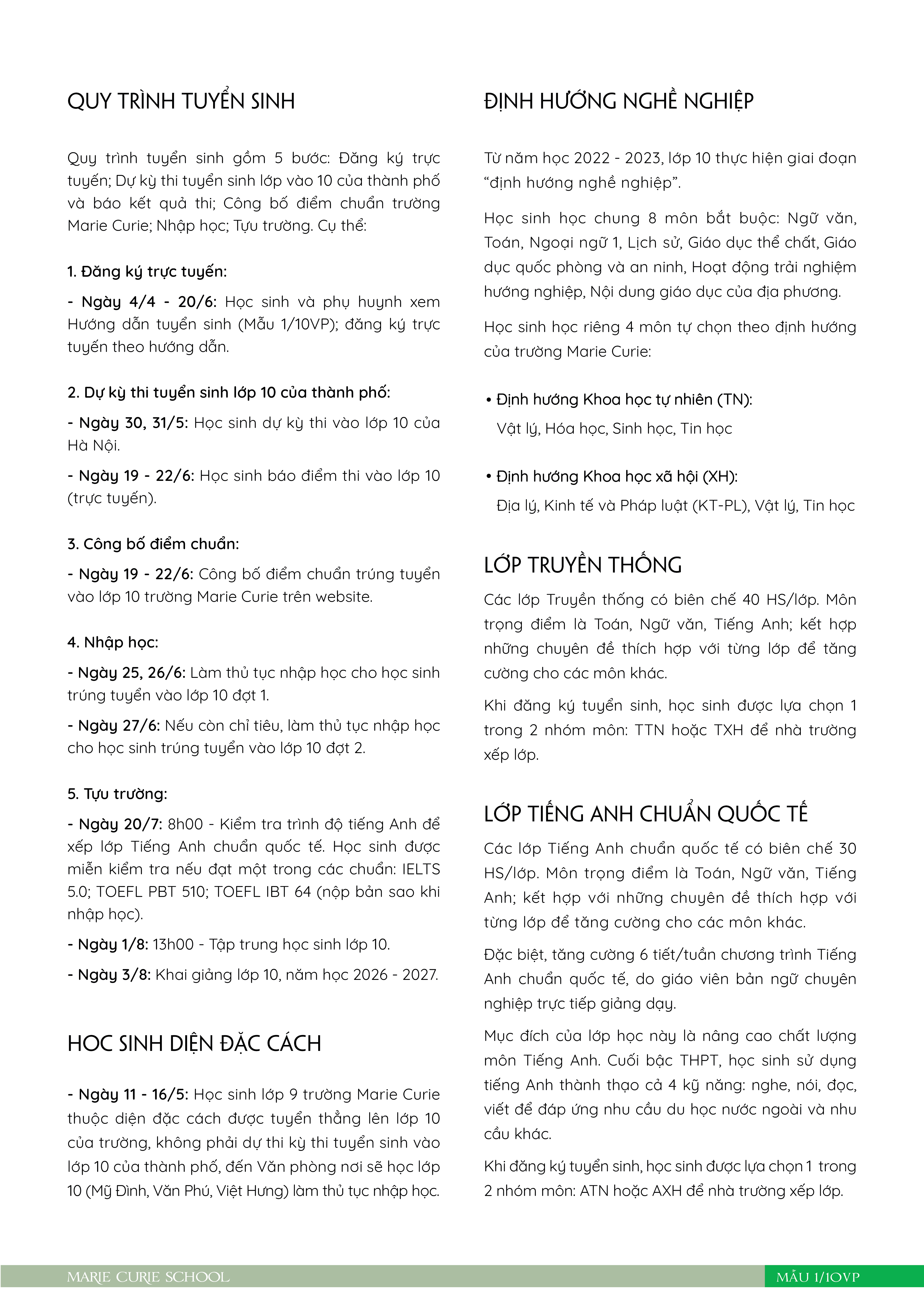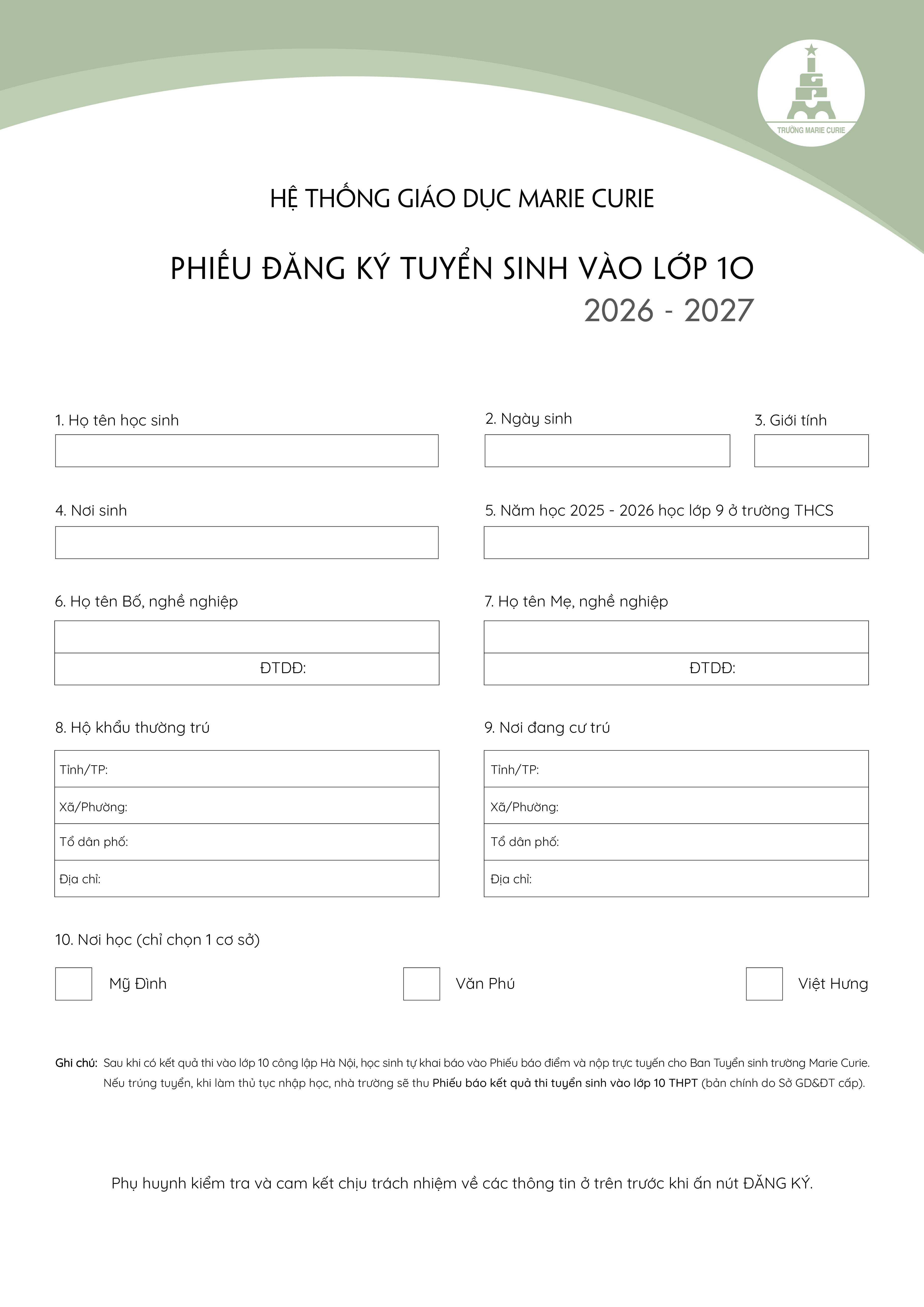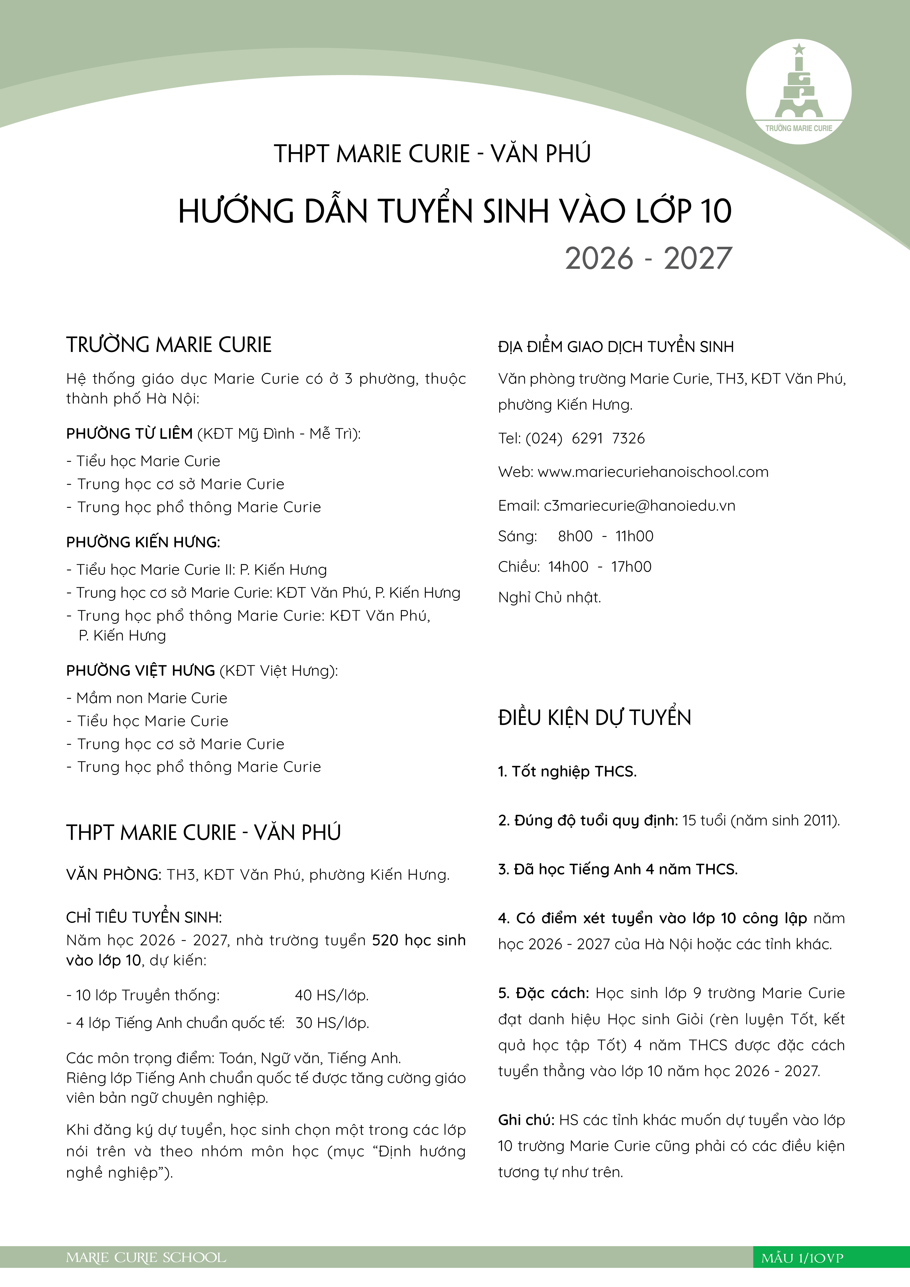 Thông báo số 3 về tuyển sinh vào lớp 10, năm học 2026 - 2027 của hệ thống giáo dục Marie Curie, Hà Nội tại cơ sở Mỹ Đình, Văn Phú và Việt Hưng.
