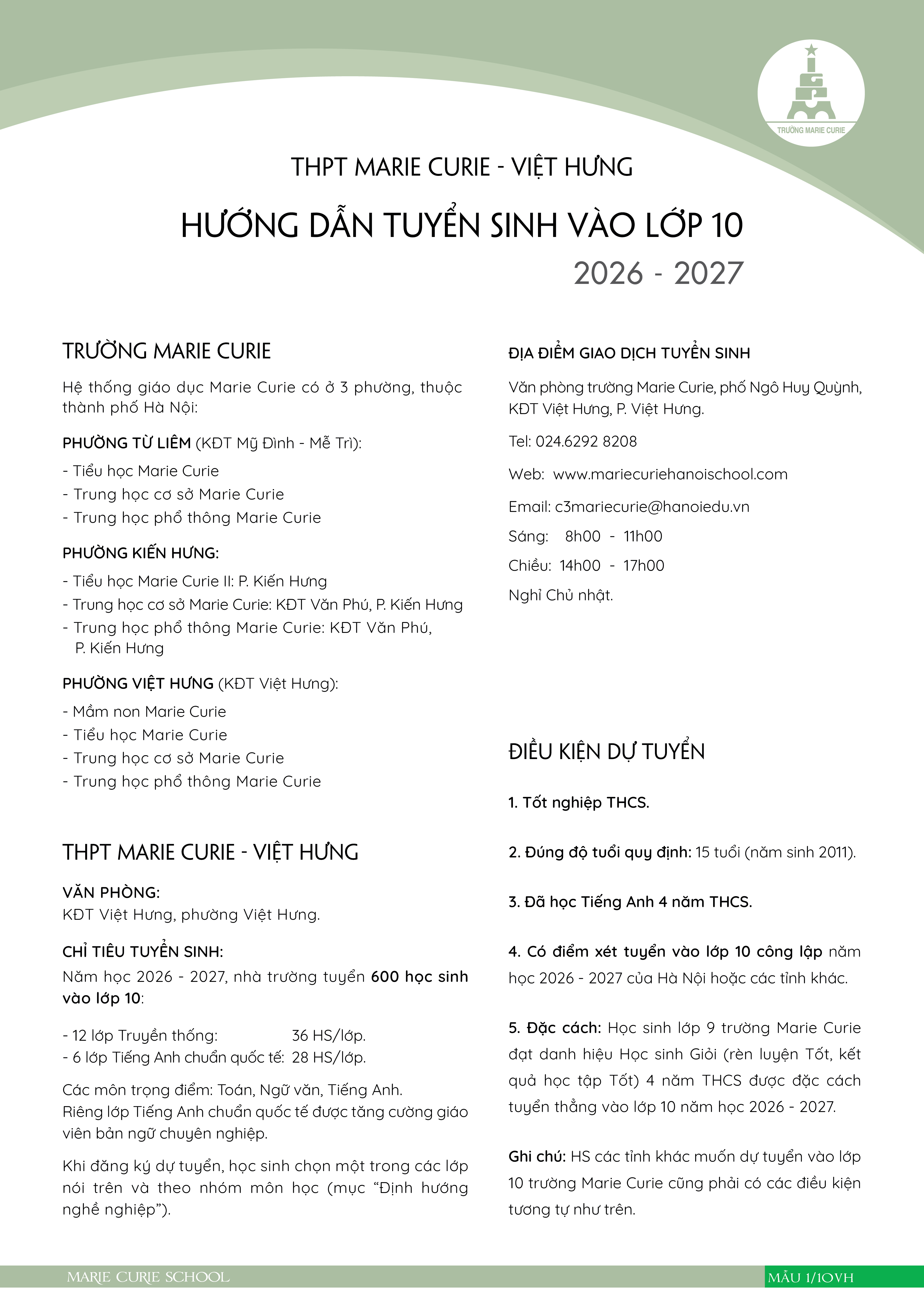 Thông báo số 3 về tuyển sinh vào lớp 10, năm học 2026 - 2027 của hệ thống giáo dục Marie Curie, Hà Nội tại cơ sở Mỹ Đình, Văn Phú và Việt Hưng.