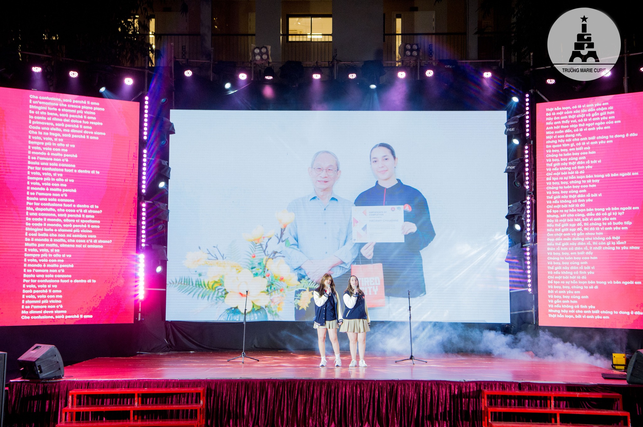 Mở màn là tiết mục song ca giao lưu của 2 du học sinh người Ý tham gia chương trình trao đổi văn hóa tại trường. Lời ca của các bạn vang lên giữa không gian MC, trong tiếng vỗ tay cổ vũ nhiệt liệt của khán giả. “Đây là lần đầu chúng mình được đứng trên sân khấu lớn như vậy. Chúng mình lúc đầu có hơi run nhưng sau đó cảm thấy rất vui và hân hoan khi nhận được những tràng pháo tay của mọi người. Chúng mình sẽ không bao giờ quên giây phút hôm nay”, các bạn nói.