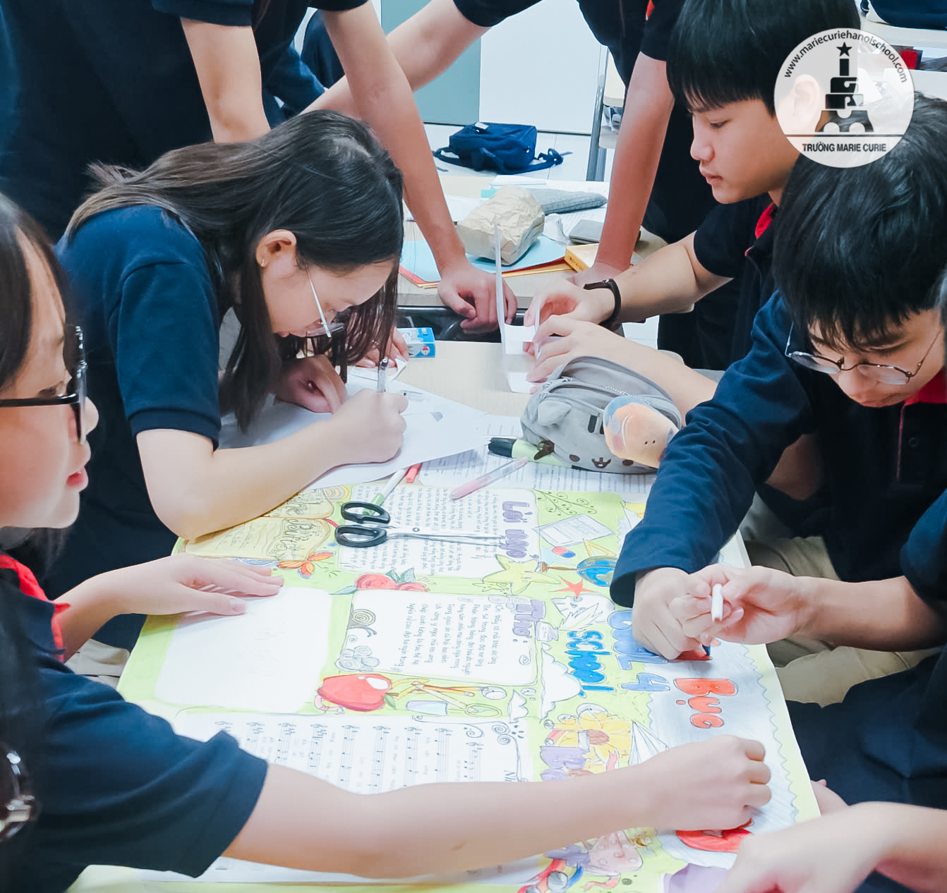 Vận dụng kiến thức Ngữ văn như thơ Lục bát, thơ Đường luật, văn miêu tả, văn cảm nghĩ…, các học sinh đã cùng nhau “xuất bản” những tờ báo tường đầy sáng tạo. Mỗi lớp được cô Hồng Minh (GV Ngữ văn) chia thành 4 nhóm với 6 - 8 thành viên. Các nhóm được khuyến khích tự sáng tác thơ, sưu tầm bài viết và thiết kế hình ảnh theo ý tưởng riêng.