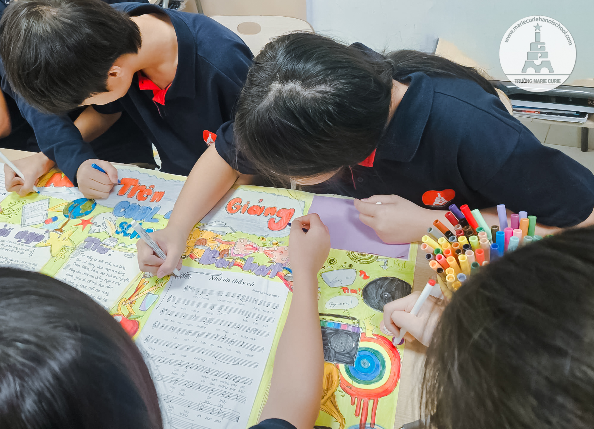 Không kém phần hào hứng, các MCer 6I2 và 6I3 cũng dồn nhiều tâm huyết vào sản phẩm của nhóm. Ngọc Khuê (6I2) tiết lộ: “Chúng mình đang học thơ Lục bát, ca dao - tục ngữ và nghị luận. Các nhóm đã cùng sưu tầm những bài thơ hay rồi tự tay viết lên báo tường. Mỗi hình ảnh, mỗi câu chữ đều thể hiện lòng biết ơn với thầy cô. Chúng mình mong các thầy cô luôn mạnh khỏe để tiếp tục truyền cảm hứng cho học trò”.