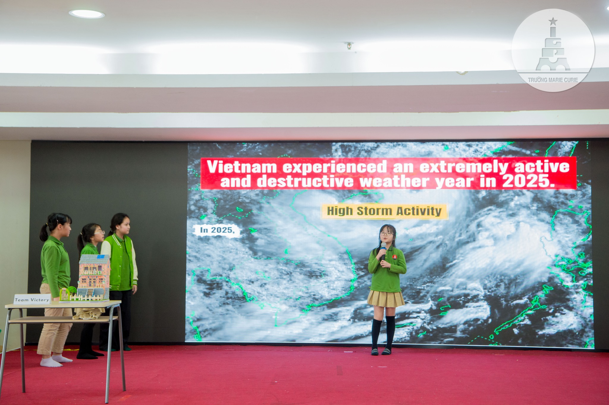 Điểm nhấn đặc biệt của vòng cuối cùng là thuyết trình sản phẩm “Ngôi nhà chống lũ”. Từ những kiến thức Khoa học, Toán học được tiếp cận trên lớp, các bạn đã cùng nhau nghiên cứu, tính toán tỷ lệ, thiết kế mô hình và trình bày ý tưởng bảo vệ cộng đồng ở vùng thiên tai. Không chỉ thể hiện sự hiểu biết chuyên môn, các đội còn cho thấy trách nhiệm đối với xã hội và tinh thần sáng tạo.