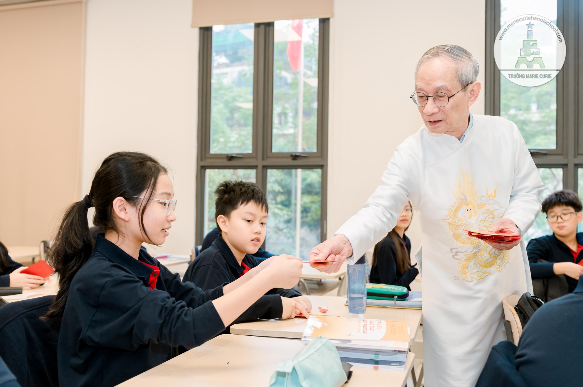 Linh Hân (6P1) vô cùng xúc động khi bất ngờ được thầy Khang vào lớp, trao lì xì Tết tận tay. Cô bạn chia sẻ: “Gắn bó với mái trường Marie Curie từ năm lớp 1, mình rất cảm phục sự quan tâm và tình yêu thương mà “ông nội” Khang cùng các thầy cô dành cho học trò. Khi nhận món quà từ “ông nội”, mình có cảm giác thật khó tả, vừa ngỡ ngàng vừa hạnh phúc, lại vừa biết ơn sâu sắc “người thuyền trưởng của MC””.