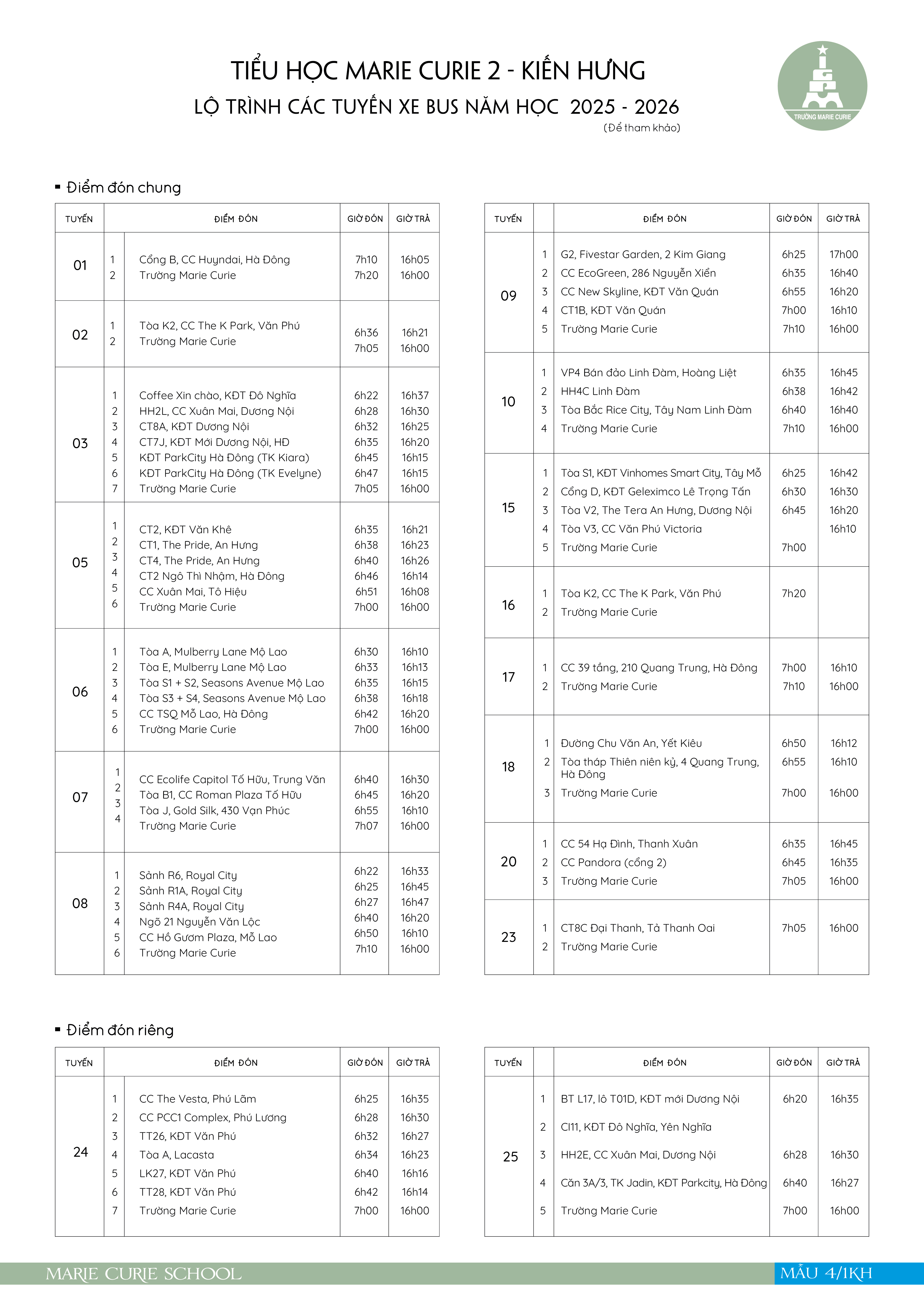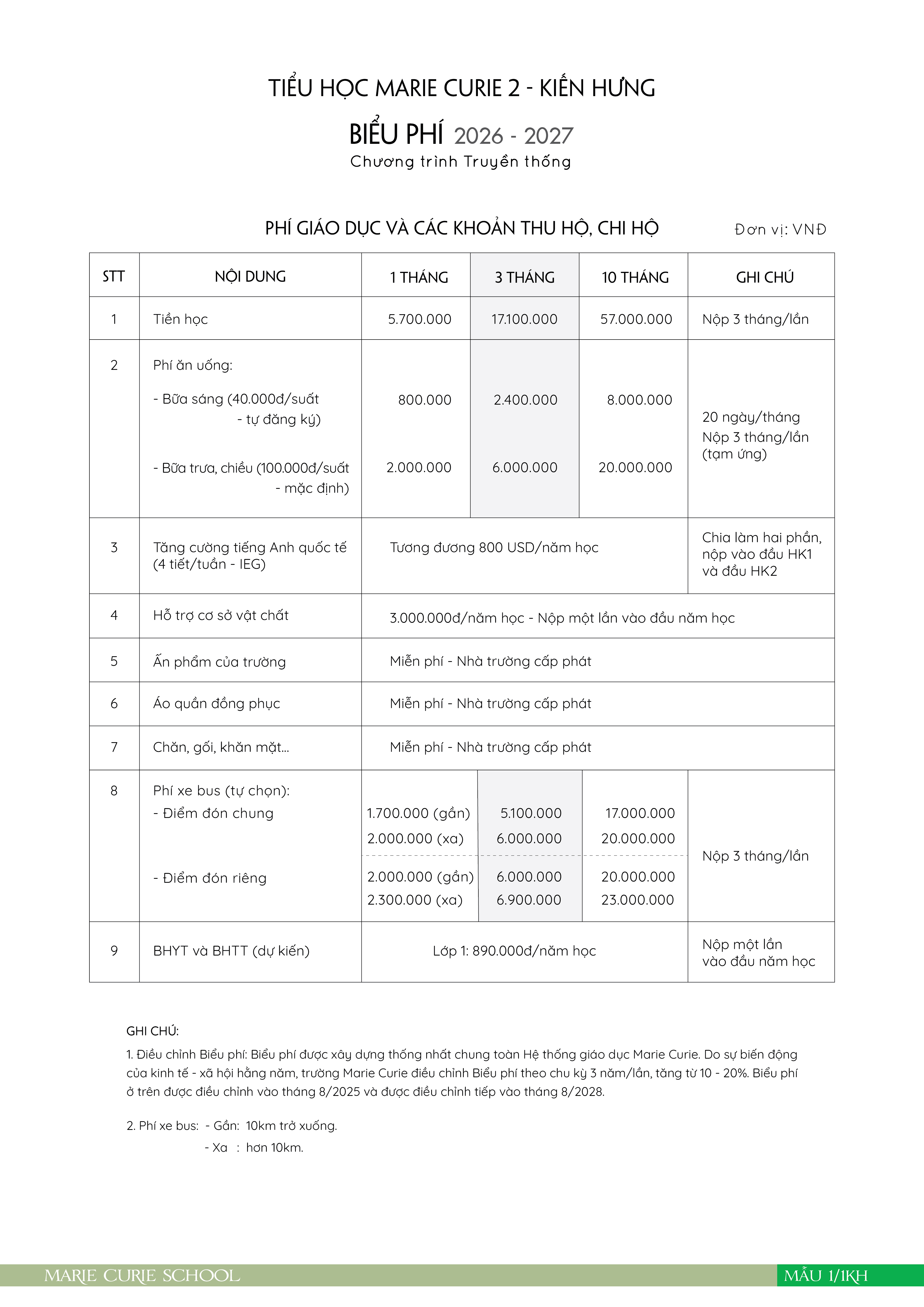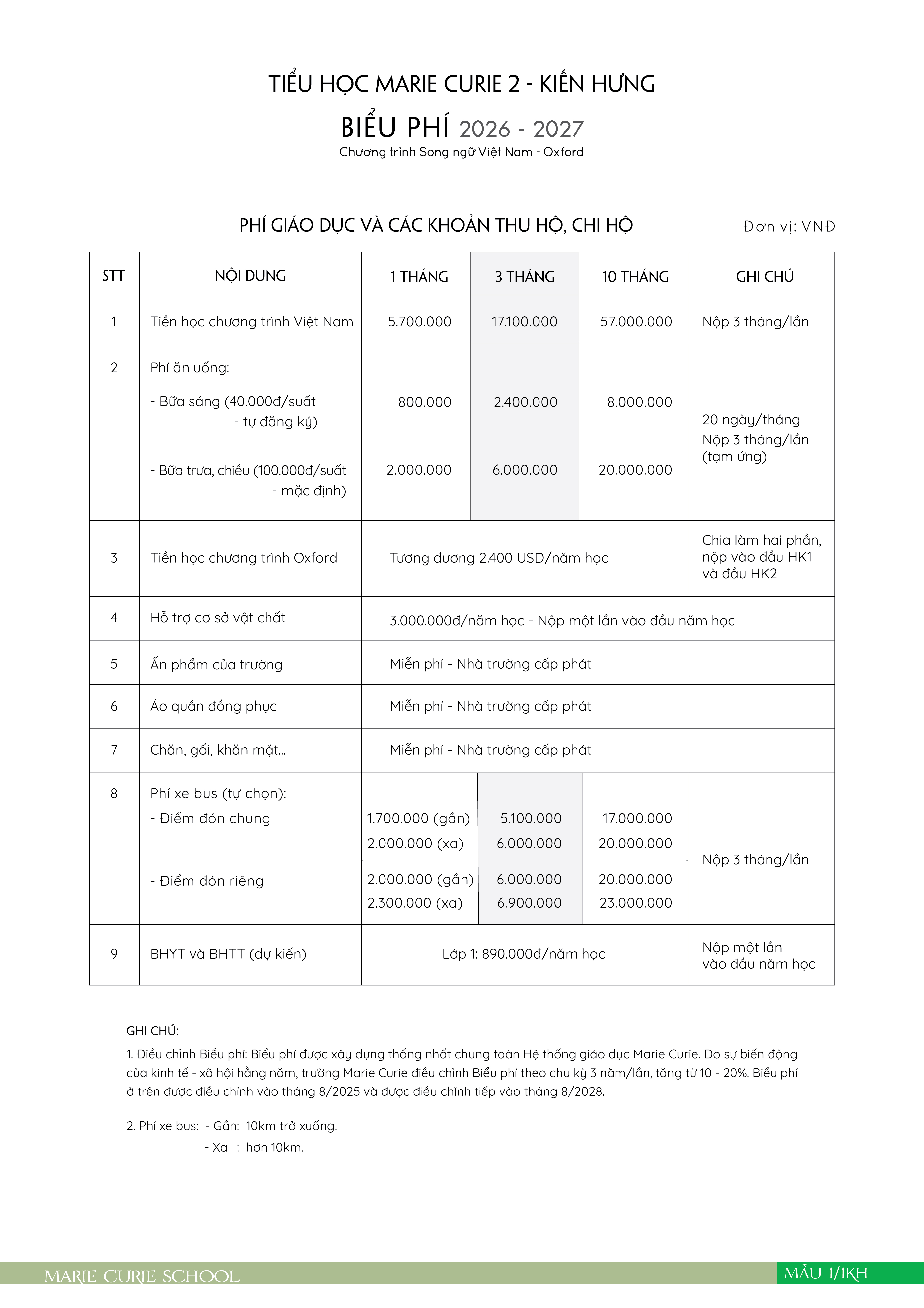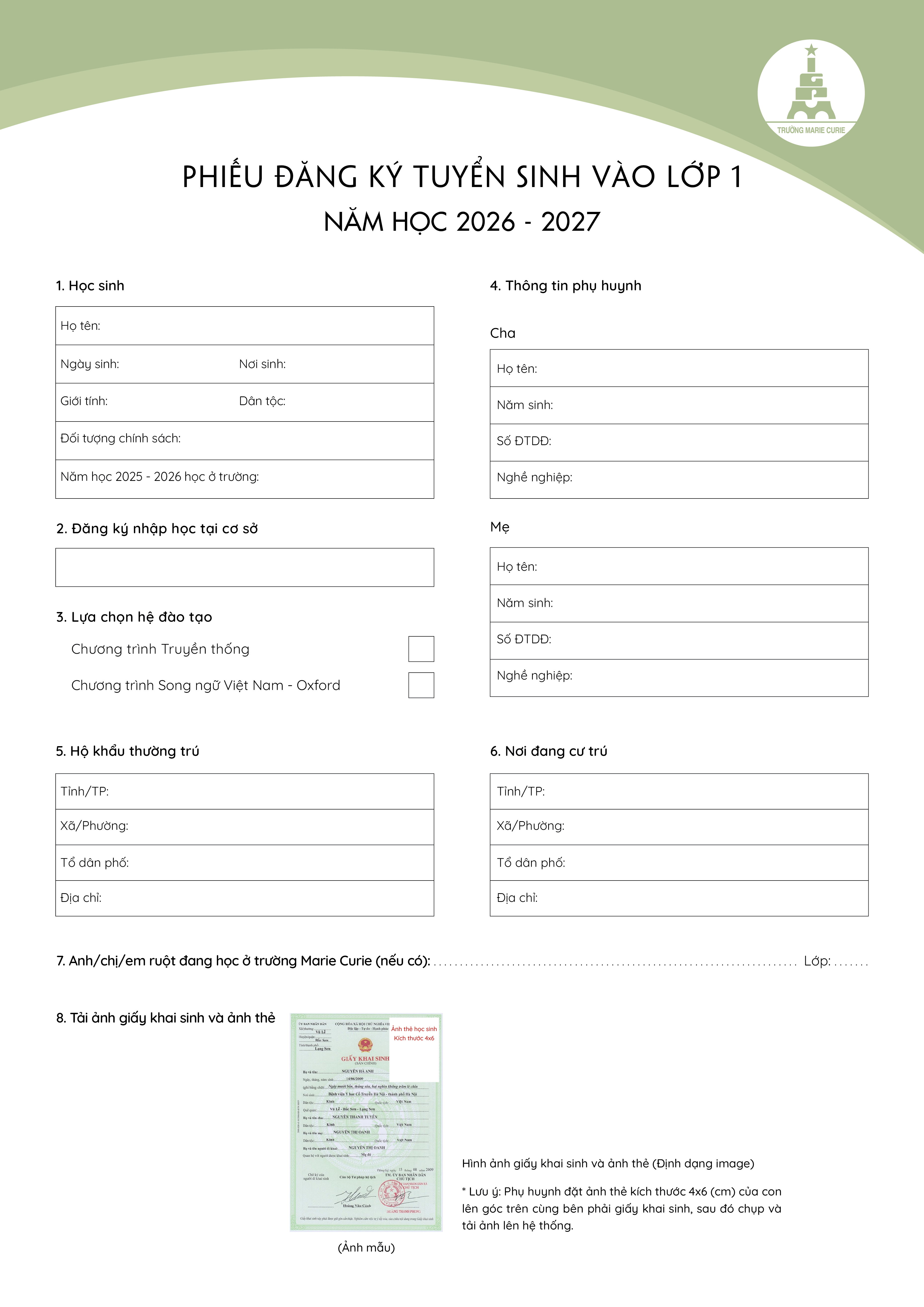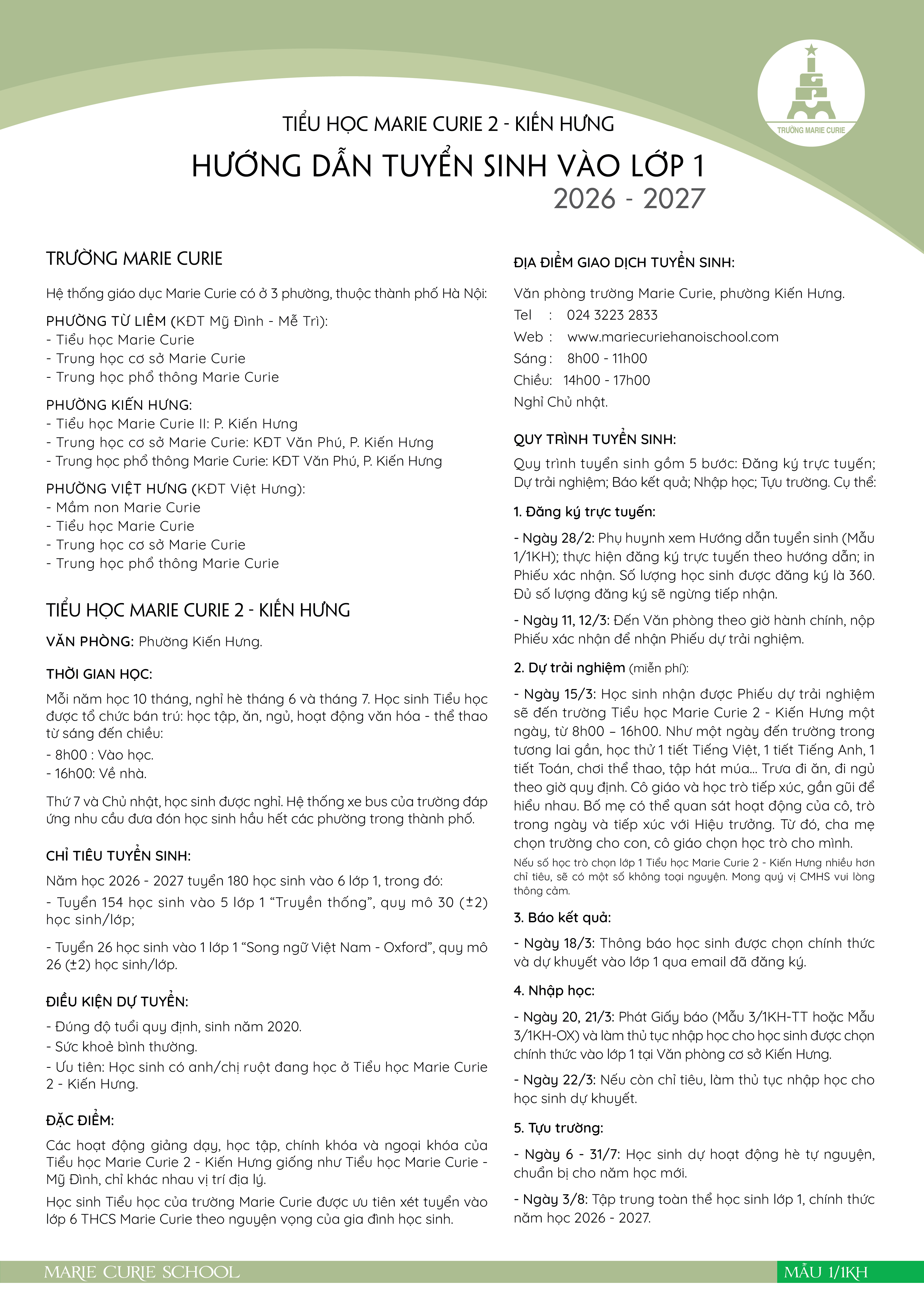 Thông báo số 2 về hướng dẫn tuyển sinh vào lớp Mẫu giáo, lớp 1 và lớp 6 năm học 2026 - 2027 của hệ thống giáo dục Marie Curie, Hà Nội.