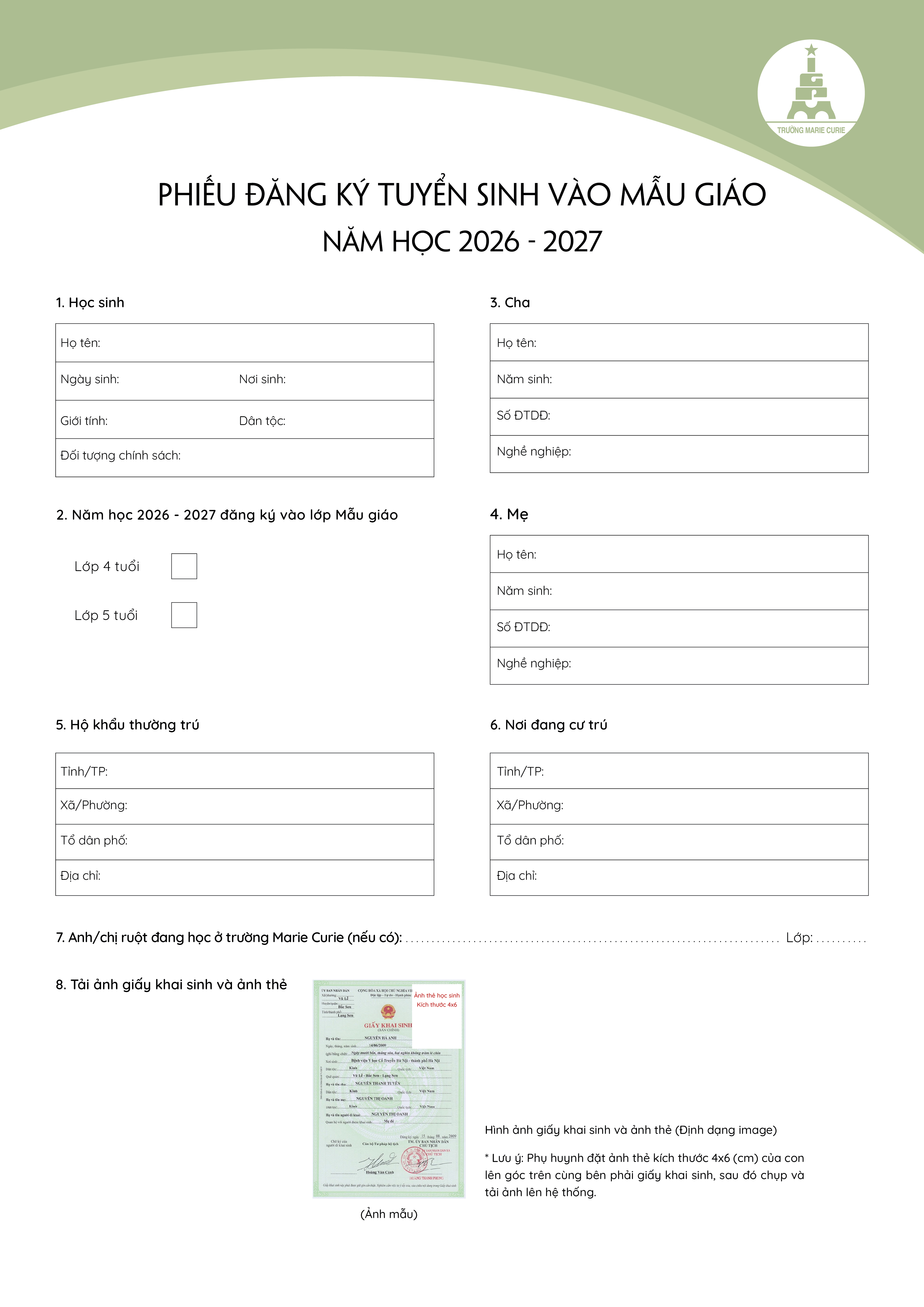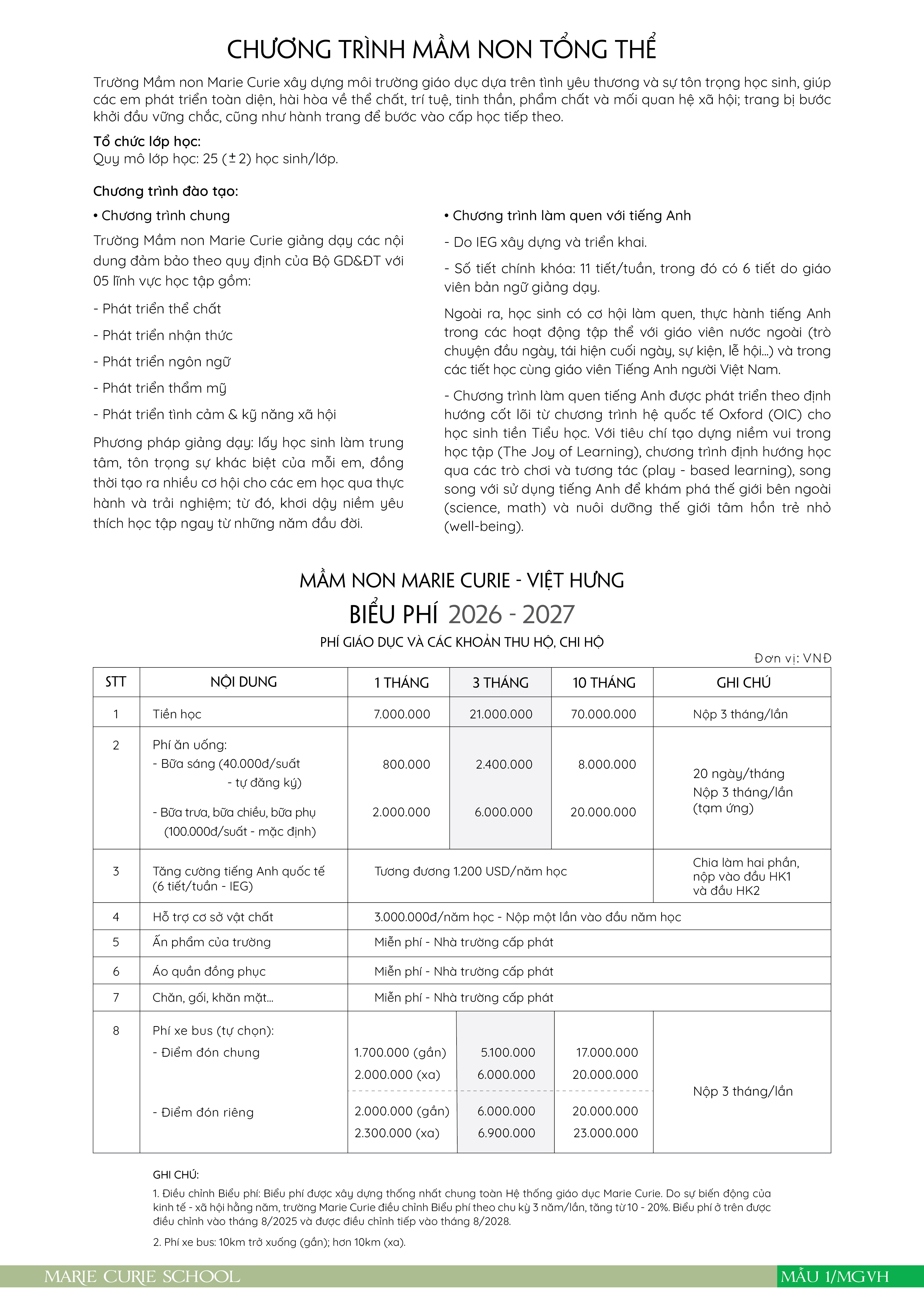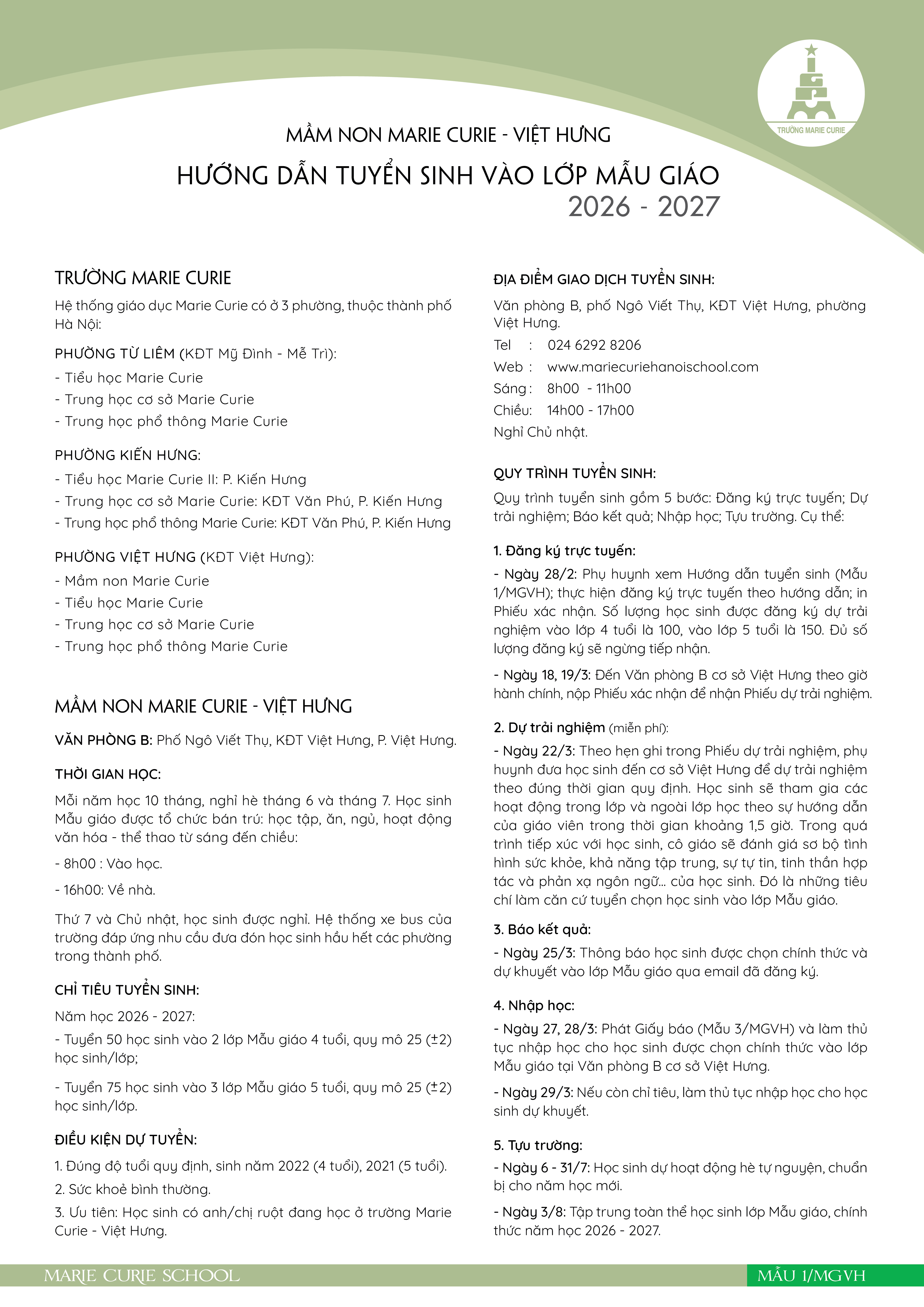 Thông báo số 2 về hướng dẫn tuyển sinh vào lớp Mẫu giáo, lớp 1 và lớp 6 năm học 2026 - 2027 của hệ thống giáo dục Marie Curie, Hà Nội.