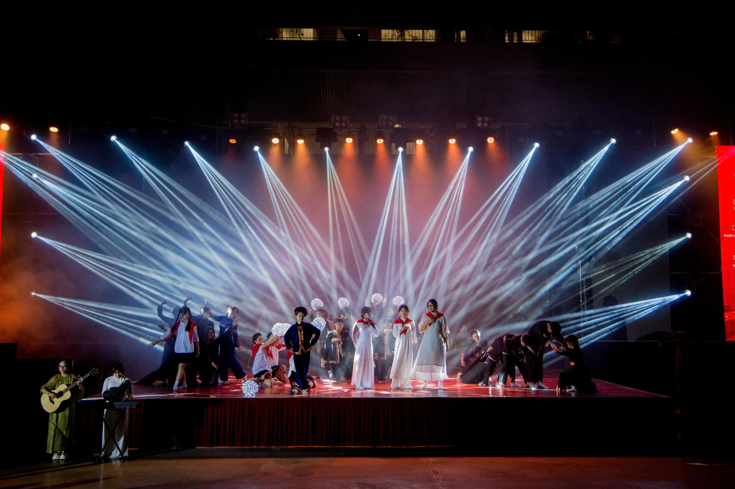 Dưới ánh đèn, màn led khủng và sân khấu vô cùng hoành tráng; cũng như sự cổ vũ, động viên của đông đảo phụ huynh, các MCer đã mang tới sự bùng nổ, bất ngờ. 25 tiết mục xuất sắc đã dẫn dắt khán giả đi theo mạch cảm xúc. Đó là ngược dòng thời gian để cảm nhận tinh thần bất khuất, kiên cường với “Bức thư thời chiến”, “Dấu ấn Trường Sơn”, “Màu cờ trong mưa”, “Đường độc lập”… trong những cuộc chiến đầy cam go một thời bom đạn, khói lửa để bảo vệ nền độc lập, tự do. Đó là lòng tự hào dân tộc, biết ơn thế hệ cha ông đã ngã xuống để đổi lấy hòa bình với “Hồn đất Việt”, “Màu cờ Tổ quốc”, “Tiến lên Việt Nam”… Và cuối cùng là sự tiếp nối của thế hệ trẻ trong tiết mục “Việt Nam thịnh vượng”, “Thanh niên vững bước tiến vào kỷ nguyên mới”, “Gen Việt - sức mạnh kết nối”…